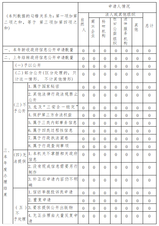 (三)依申請(qǐng)公開方面。一年以來(lái),我局高度重視依申請(qǐng)公開工作,不斷完善制度機(jī)制,堅(jiān)持依法規(guī)范辦理,狠抓依申請(qǐng)辦理質(zhì)量,切實(shí)保障公眾知情權(quán),積極化解社會(huì)矛盾,不斷增強(qiáng)人民群眾獲得感和幸福感。我局受理依申請(qǐng)公開共計(jì)0件。