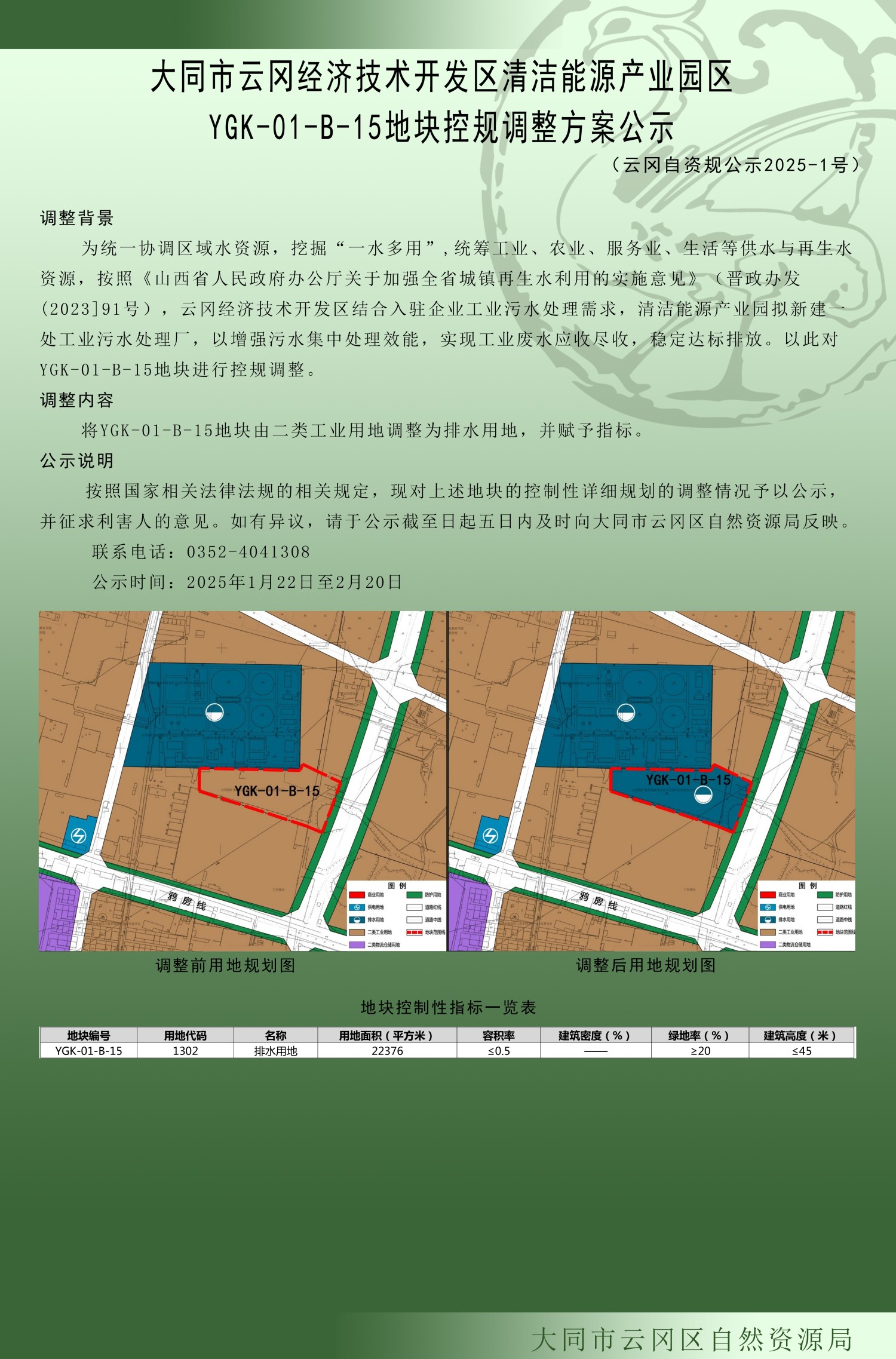 大同市云岡經(jīng)濟(jì)技術(shù)開(kāi)發(fā)區(qū)清潔能源產(chǎn)業(yè)園區(qū)YGK-01-B-15地塊控規(guī)調(diào)整方案公示