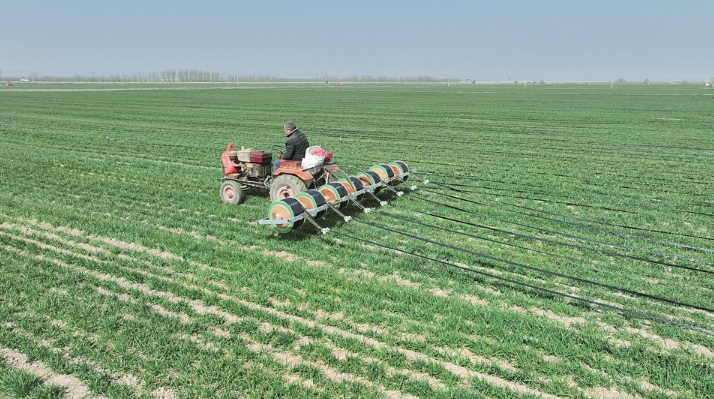 二月二十六日,農戶駕駛小型拖拉機在永濟市蒲州鎮(zhèn)黃河灘的麥田里鋪設滴灌設施,以便麥苗及時喝上“返青水”,確保夏糧豐收。陳春明 攝