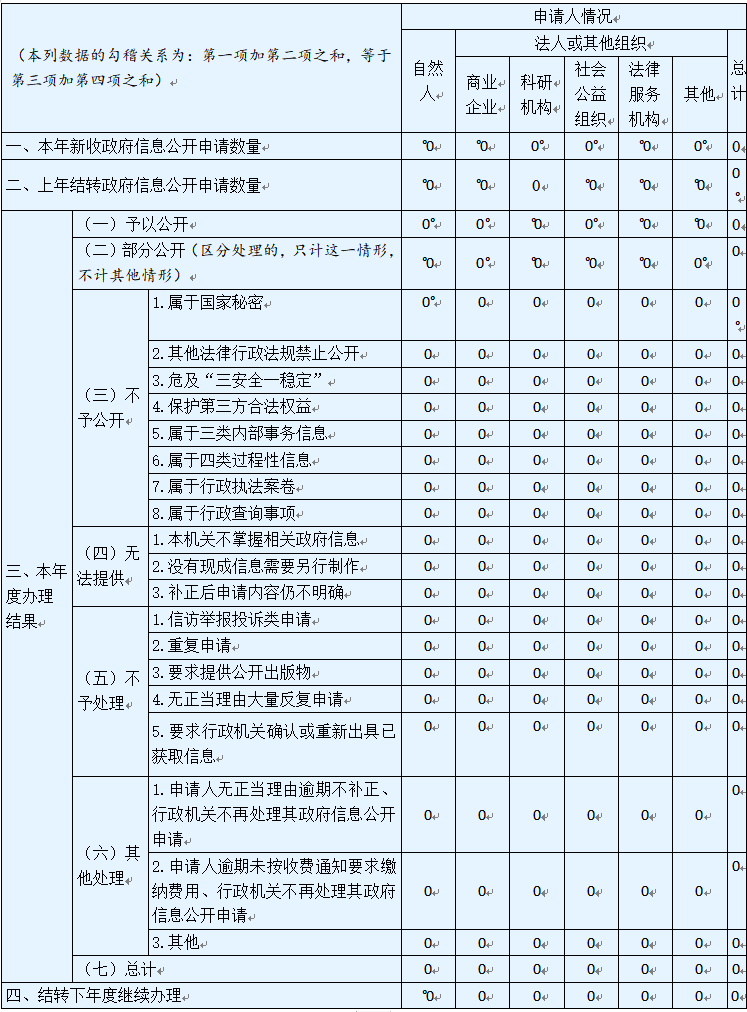 依申請公開方面。去年以來,我局高度重視依申請公開工作,不斷完善制度機制,堅持依法規(guī)范辦理,狠抓依申請辦理質(zhì)量,切實保障公眾知情權(quán),積極化解社會矛盾,不斷增強人民群眾獲得感和幸福感。我局受理依申請公開共計0件。