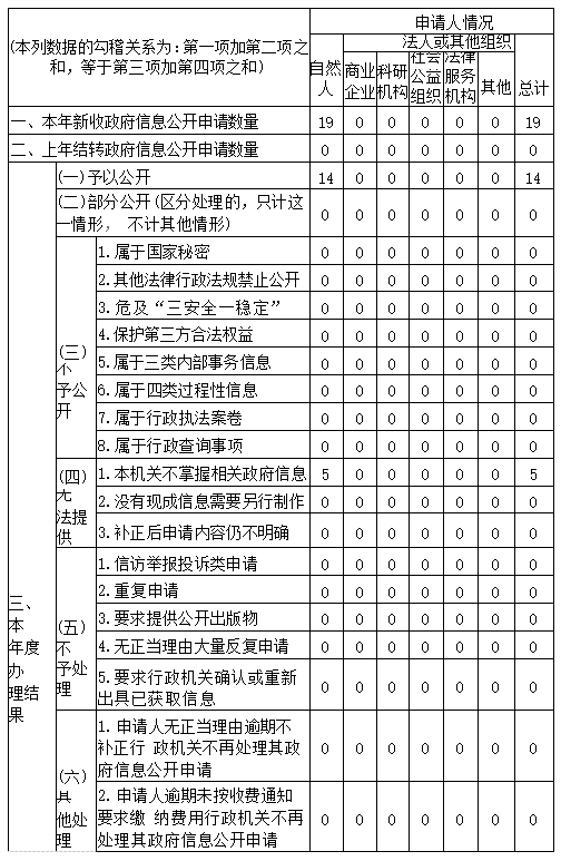 2023年區(qū)政府辦公室共受理政府信息公開申請件19件,其中,自然人19件,企業(yè)法人0件,法律服務(wù)機構(gòu)0件,受理的申請件已全部按規(guī)定在法定期限內(nèi)予以答復(fù)。2023年無新增政府信息公開行政訴訟案。