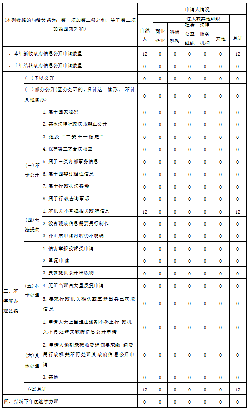 2024年區(qū)政府辦公室共受理政府信息公開申請(qǐng)件12件,其中,自然人12件,企業(yè)法人0件,法律服務(wù)機(jī)構(gòu)0件,受理的申請(qǐng)件已全部按規(guī)定在法定期限內(nèi)予以答復(fù)。2024年新增政府信息公開行政訴訟案件2件,勝訴2件。